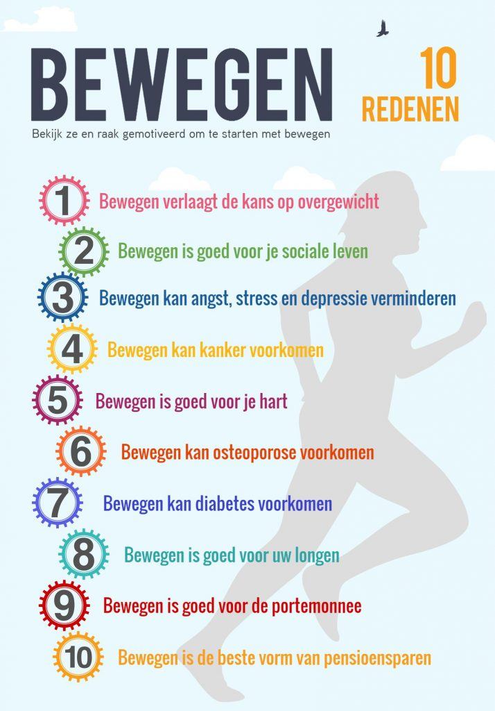 Beweging is van grote invloed op gezonde leefstijl. Het voorkomt overgewicht, het is goed voor je sociale leven (door samen te sporten), bewegen voorkomst ziektes als kanker, ouderdom ziekten hart- en vaatziekten, het is goed voor je hart, voorkomt osteoporose, kan diabetes voorkomen en het kan stress, angst en depressie verminderen. Wetenschappelijke bouwt je lichaam op natuurlijke wijze stresshormonen af en maakt je lichaam meer endorfine aan (het geluk hormoon) (Kennisbank van sport en bewegen, 2016). Dit zal dus zeker van grote invloed zijn en bijdragen aan 'het 'gelukkig zijn' en 'goed in je vel voelen'.